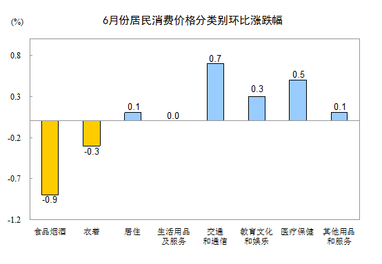 6月份,其他七大类价格环比五涨一降一平。其中,交通和通信、医疗保健、教育文化和娱乐、居住、其他用品和服务价格分别上涨0.7%、0.5%、0.3%、0.1%、0.1%;衣着价格下降0.3%;生活用品及服务价格持平。