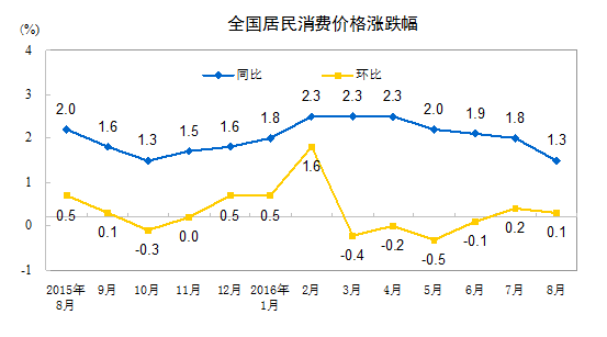 2016年8月份居民消费价格同比上涨1.3%