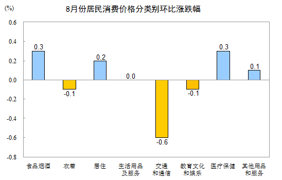 8月份,其他七大类价格环比三涨三降一平。其中,医疗保健、居住、其他用品和服务价格分别上涨0.3%、0.2%、0.1%;交通和通信、衣着、教育文化和娱乐价格分别下降0.6%、0.1%、0.1%;生活用品及服务价格持平。
