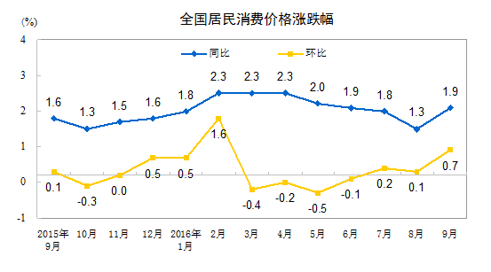 2016年9月份居民消费价格同比上涨1.9%