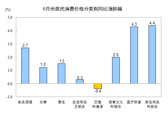 9月份,其他七大类价格同比六涨一降。其中,其他用品和服务、医疗保健、教育文化和娱乐、居住、衣着、生活用品及服务价格分别上涨4.4%、4.3%、2.0%、1.5%、1.2%、0.3%;交通和通信价格下降0.4%。