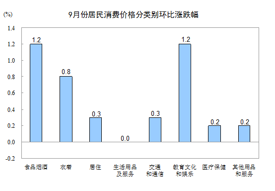9月份,其他七大类价格环比六涨一平。其中,教育文化和娱乐、衣着、居住、交通和通信、医疗保健、其他用品和服务价格分别上涨1.2%、0.8%、0.3%、0.3%、0.2%、0.2%;生活用品及服务价格持平。