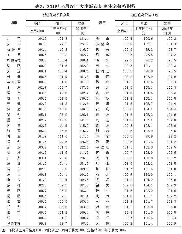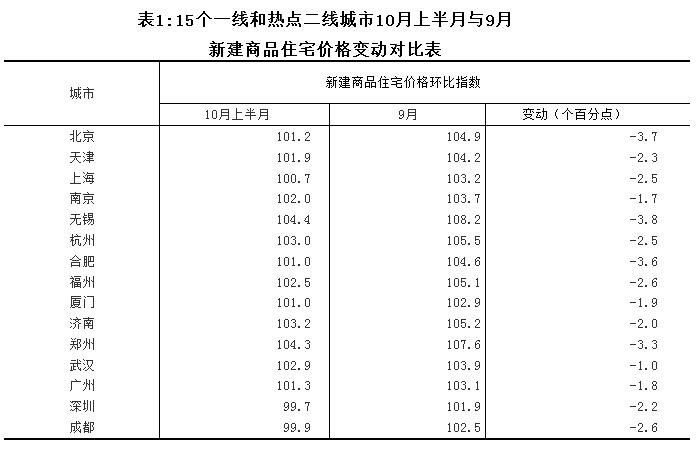 注1:为快速反映近期房地产市场的变化,国家统计局在做好9月份70个大中城市房价统计的同时,对其中一线和部分热点二线城市10月上半月的房地产市场情况进行了统计。