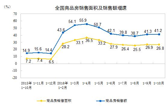 1-10月份,商品房销售面积120338万平方米,同比增长26.8%,增速比1-9月份回落0.1个百分点。其中,住宅销售面积增长27.0%,办公楼销售面积增长36.1%,商业营业用房销售面积增长19.3%。商品房销售额91482亿元,增长41.2%,增速回落0.1个百分点。其中,住宅销售额增长42.6%,办公楼销售额增长56.5%,商业营业用房销售额增长23.2%。