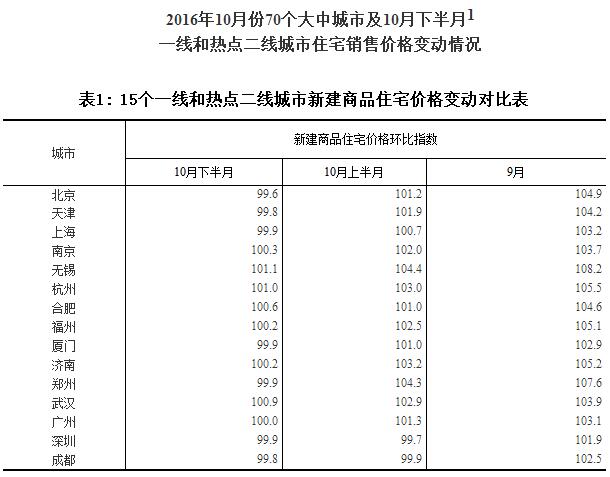 注1:为快速反映近期房地产市场的变化,国家统计局在做好9月份70个大中城市房价统计的同时,对其中一线和部分热点二线城市10月上半月的房地产市场情况进行了统计。