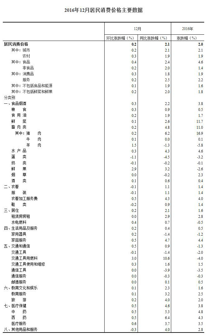 2016年12月份居民消费价格同比上涨2.1%