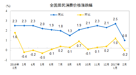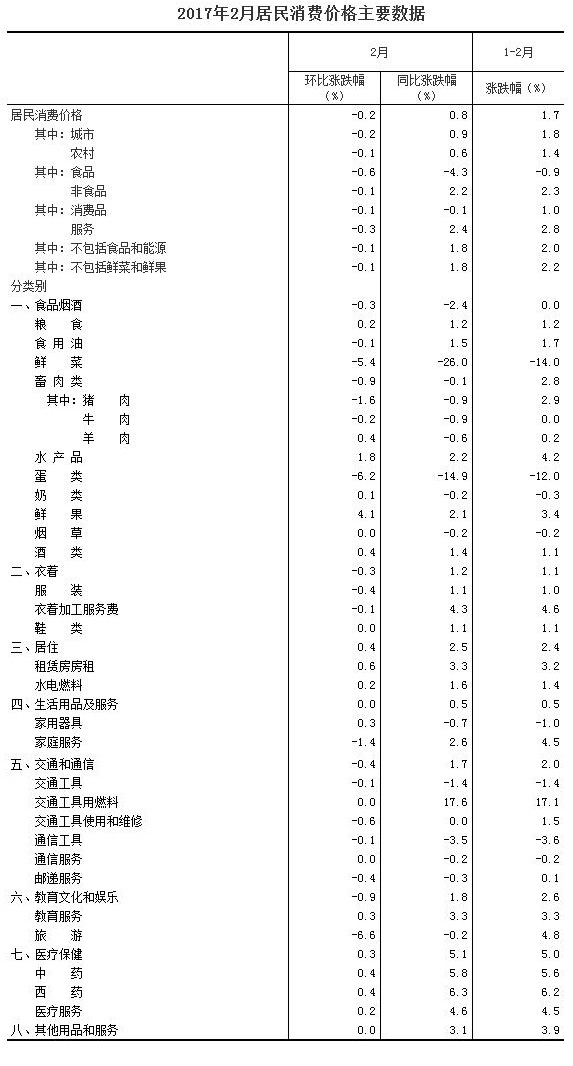 2017年2月份,全国居民消费价格总水平同比上涨0.8%。其中,城市上涨0.9%,农村上涨0.6%;食品价格下降4.3%,非食品价格上涨2.2%;消费品价格下降0.1%,服务价格上涨2.4%。1-2月平均,全国居民消费价格总水平比去年同期上涨1.7%。