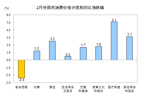 2月份,其他七大类价格同比均有所上涨。其中,医疗保健、其他用品和服务、居住、教育文化和娱乐、交通和通信、衣着、生活用品及服务价格分别上涨5.1%、3.1%、2.5%、1.8%、1.7%、1.2%和0.5%。