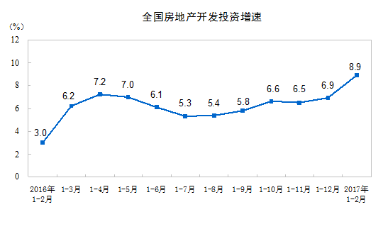 2017年1-2月份,全国房地产开发投资9854亿元,同比名义增长8.9%,增速比去年全年提高2个百分点。其中,住宅投资6571亿元,增长9.0%,增速提高2.6个百分点。住宅投资占房地产开发投资的比重为66.7%。