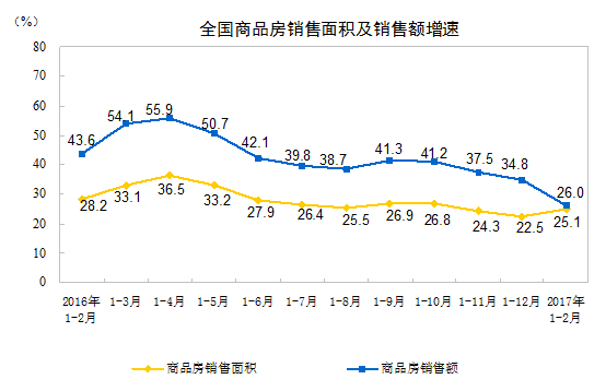 1-2月份,商品房销售面积14054万平方米,同比增长25.1%,增速比去年全年提高2.6个百分点。其中,住宅销售面积增长23.7%,办公楼销售面积增长39.1%,商业营业用房销售面积增长31.8%。商品房销售额10806亿元,增长26.0%,增速回落8.8个百分点。其中,住宅销售额增长22.7%,办公楼销售额增长49.3%,商业营业用房销售额增长41.6%。