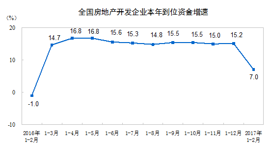 1-2月份,房地产开发企业到位资金22880亿元,同比增长7.0%,增速比去年全年回落8.2个百分点。其中,国内贷款4985亿元,增长11.5%;利用外资48亿元,增长227.4%;自筹资金6897亿元,下降17.2%;其他资金10950亿元,增长27.7%。在其他资金中,定金及预收款6108亿元,增长27.1%;个人按揭贷款3391亿元,增长20.4%。