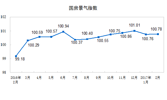 2月份,房地产开发景气指数(简称“国房景气指数”,今年起发布的是基期修定后的值)为100.78,比1月份提高0.02点。