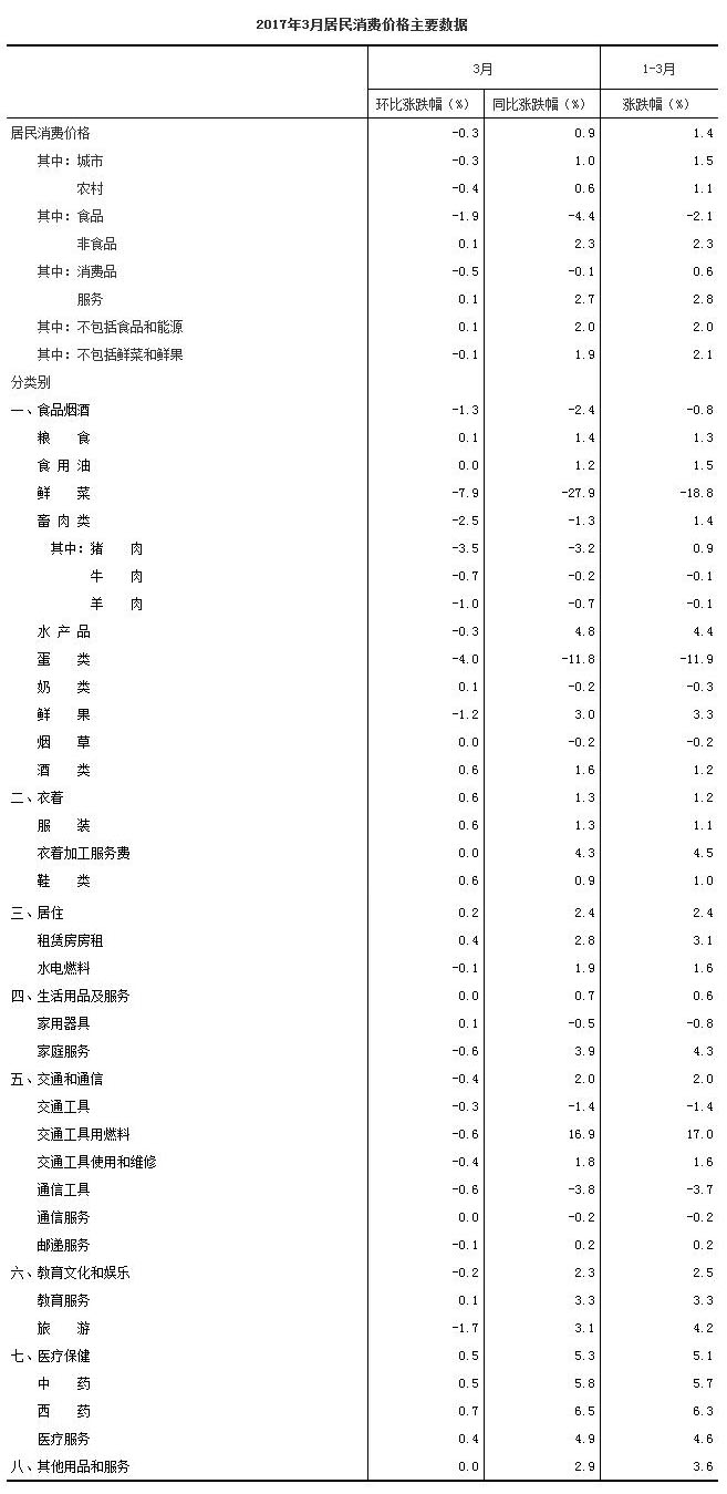 2017年3月份,全国居民消费价格总水平同比上涨0.9%。其中,城市上涨1.0%,农村上涨0.6%;食品价格下降4.4%,非食品价格上涨2.3%;消费品价格下降0.1%,服务价格上涨2.7%。一季度,全国居民消费价格总水平比去年同期上涨1.4%。