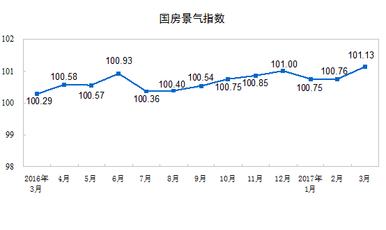 3月份,房地产开发景气指数(简称“国房景气指数”)为101.13,比2月份提高0.37点。