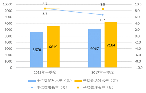 一季度,全国居民人均可支配收入中位数6067元,增长6.7%(以下如无特别说明,均为同比名义增长),中位数是平均数的84.4%。其中,城镇居民人均可支配收入中位数8700元,增长6.7%,是平均数的87.1%;农村居民人均可支配收入中位数3060元,增长7.1%,是平均数的78.9%。