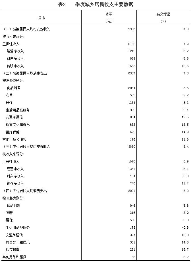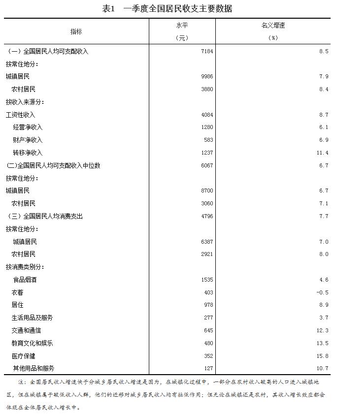 一季度,全国居民人均可支配收入7184元,比上年同期名义增长8.5%,扣除价格因素,实际增长7.0%。其中,城镇居民人均可支配收入9986元,增长7.9%,扣除价格因素,实际增长6.3%;农村居民人均可支配收入3880元,增长8.4%,扣除价格因素,实际增长7.2%。