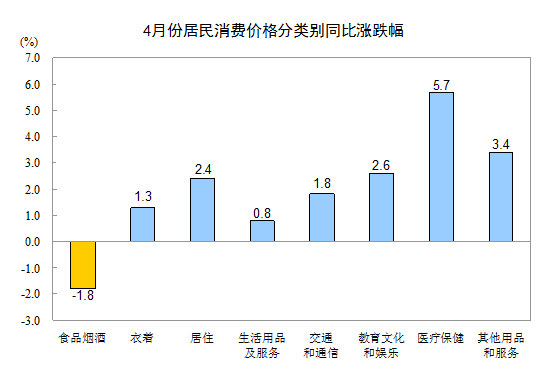 4月份,食品烟酒价格同比下降1.8%,影响CPI下降约0.56个百分点。其中,鲜菜价格下降21.6%,影响CPI下降约0.65个百分点;蛋价格下降11.4%,影响CPI下降约0.07个百分点;畜肉类价格下降4.6%,影响CPI下降约0.23个百分点(猪肉价格下降8.1%,影响CPI下降约0.24个百分点);水产品价格上涨5.9%,影响CPI上涨约0.11个百分点;鲜果价格上涨5.9%,影响CPI上涨约0.10个百分点;粮食价格上涨1.5%,影响CPI上涨约0.03个百分点。