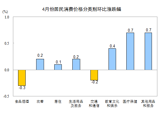 4月份,全国居民消费价格总水平环比上涨0.1%。其中,城市上涨0.1%,农村持平;食品价格下降0.6%,非食品价格上涨0.2%;消费品价格下降0.1%,服务价格上涨0.4%。