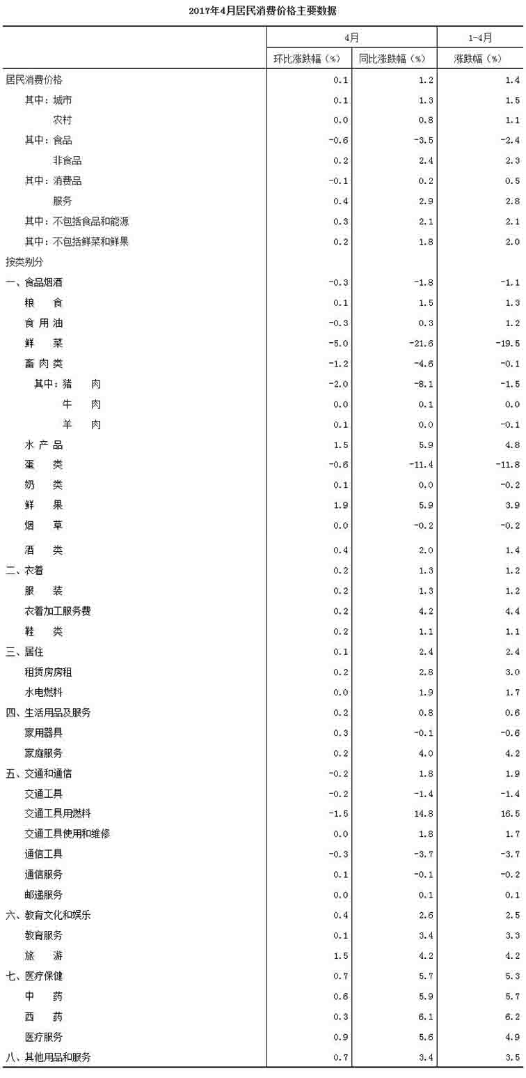 2017年4月份,全国居民消费价格总水平同比上涨1.2%。其中,城市上涨1.3%,农村上涨0.8%;食品价格下降3.5%,非食品价格上涨2.4%;消费品价格上涨0.2%,服务价格上涨2.9%。1-4月平均,全国居民消费价格总水平比去年同期上涨1.4%。