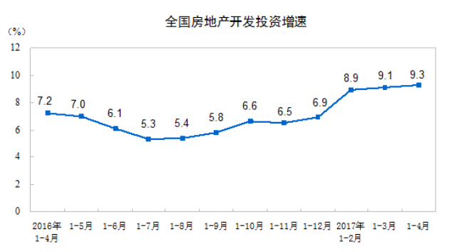 2017年1-4月份,全国房地产开发投资27732亿元,同比名义增长9.3%,增速比1-3月份提高0.2个百分点。其中,住宅投资18671亿元,增长10.6%,增速回落0.6个百分点。住宅投资占房地产开发投资的比重为67.3%。