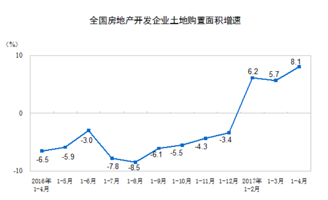 1-4月份,房地产开发企业土地购置面积5528万平方米,同比增长8.1%,增速比1-3月份提高2.4个百分点;土地成交价款2104亿元,增长34.2%,增速提高17.5个百分点。