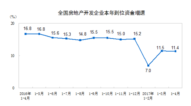 1-4月份,房地产开发企业到位资金47221亿元,同比增长11.4%,增速比1-3月份回落0.1个百分点。其中,国内贷款8774亿元,增长17.0%;利用外资74亿元,增长115.3%;自筹资金14217亿元,下降4.7%;其他资金24156亿元,增长21.3%。在其他资金中,定金及预收款13842亿元,增长21.7%;个人按揭贷款7662亿元,增长14.5%。