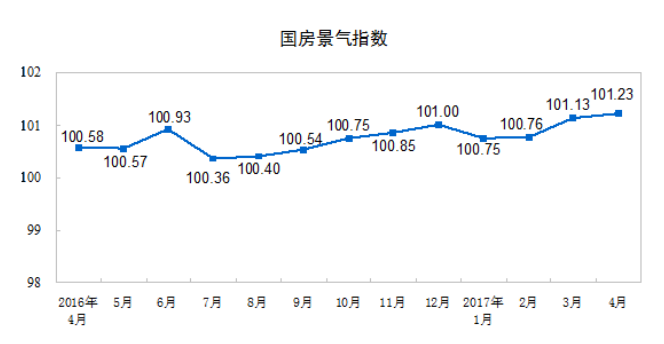 4月份,房地产开发景气指数(简称“国房景气指数”)为101.23,比3月份提高0.10点。