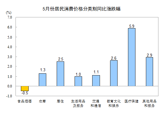 5月份,其他七大类价格同比均有所上涨。其中,医疗保健价格上涨5.9%,其他用品和服务价格上涨2.9%,教育文化和娱乐价格上涨2.6%,居住价格上涨2.5%,衣着、交通和通信、生活用品及服务价格分别上涨1.3%、1.1%和1.0%。
