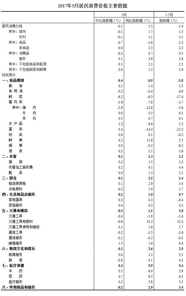 2017年5月份,全国居民消费价格总水平同比上涨1.5%。其中,城市上涨1.7%,农村上涨1.1%;食品价格下降1.6%,非食品价格上涨2.3%;消费品价格上涨0.7%,服务价格上涨2.9%。1-5月平均,全国居民消费价格总水平比去年同期上涨1.4%。