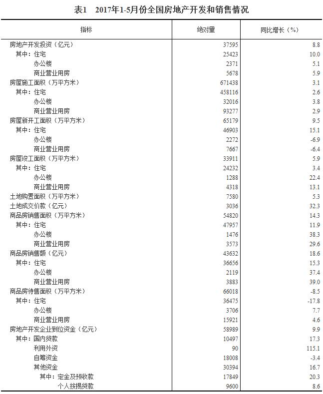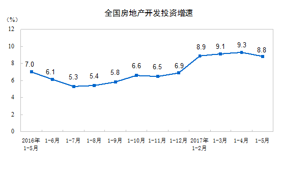 2017年1-5月份,全国房地产开发投资37595亿元,同比名义增长8.8%,增速比1-4月份回落0.5个百分点。其中,住宅投资25423亿元,增长10.0%,增速回落0.6个百分点。住宅投资占房地产开发投资的比重为67.6%。