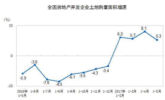 1-5月份,房地产开发企业土地购置面积7580万平方米,同比增长5.3%,增速比1-4月份回落2.8个百分点;土地成交价款3036亿元,增长32.3%,增速回落1.9个百分点。