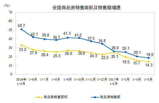 1-5月份,商品房销售面积54820万平方米,同比增长14.3%,增速比1-4月份回落1.4个百分点。其中,住宅销售面积增长11.9%,办公楼销售面积增长38.3%,商业营业用房销售面积增长29.6%。商品房销售额43632亿元,增长18.6%,增速回落1.5个百分点。其中,住宅销售额增长15.3%,办公楼销售额增长37.4%,商业营业用房销售额增长39.0%。