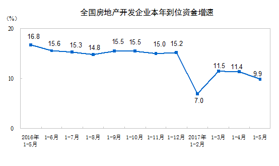 1-5月份,房地产开发企业到位资金58989亿元,同比增长9.9%,增速比1-4月份回落1.5个百分点。其中,国内贷款10497亿元,增长17.3%;利用外资90亿元,增长115.1%;自筹资金18008亿元,下降3.4%;其他资金30394亿元,增长16.7%。在其他资金中,定金及预收款17849亿元,增长20.3%;个人按揭贷款9600亿元,增长8.6%。