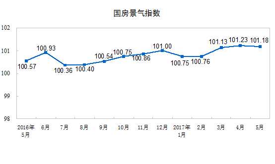5月份,房地产开发景气指数(简称“国房景气指数”)为101.18,比4月份提高0.05点。