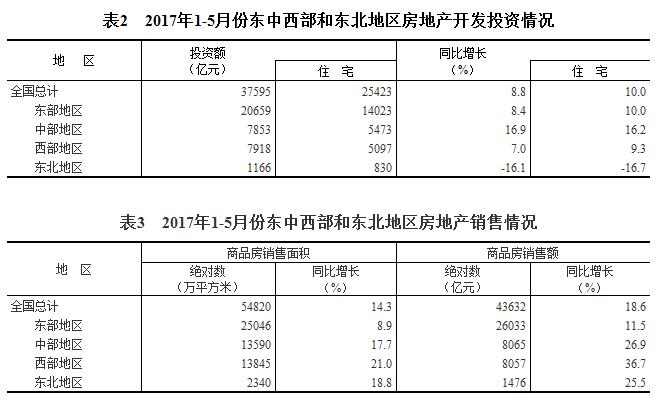 1-5月份,东部地区房地产开发投资20659亿元,同比增长8.4%,增速比1-4月份回落0.3个百分点;中部地区投资7853亿元,增长16.9%,增速提高0.1个百分点;西部地区投资7918亿元,增长7.0%,增速回落0.7个百分点;东北地区投资1166亿元,下降16.1%,降幅扩大2.4个百分点。
