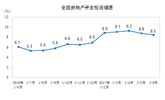 2017年1-6月份,全国房地产开发投资50610亿元,同比名义增长8.5%,增速比1-5月份回落0.3个百分点。其中,住宅投资34318亿元,增长10.2%,增速提高0.2个百分点。住宅投资占房地产开发投资的比重为67.8%。