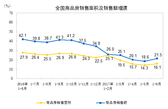 1-6月份,商品房销售面积74662万平方米,同比增长16.1%,增速比1-5月份提高1.8个百分点。其中,住宅销售面积增长13.5%,办公楼销售面积增长38.8%,商业营业用房销售面积增长32.5%。商品房销售额59152亿元,增长21.5%,增速提高2.9个百分点。其中,住宅销售额增长17.9%,办公楼销售额增长38.9%,商业营业用房销售额增长41.7%。