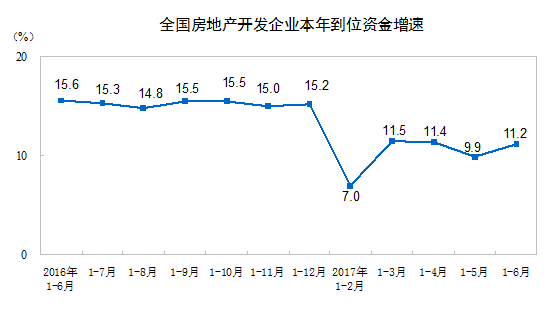 1-6月份,房地产开发企业到位资金75765亿元,同比增长11.2%,增速比1-5月份提高1.3个百分点。其中,国内贷款13352亿元,增长22.1%;利用外资104亿元,增长58.9%;自筹资金23273亿元,下降2.3%;其他资金39035亿元,增长17.2%。在其他资金中,定金及预收款23226亿元,增长22.7%;个人按揭贷款12000亿元,增长6.7%。