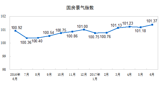 6月份,房地产开发景气指数(简称“国房景气指数”)为101.37,比5月份提高0.19点。