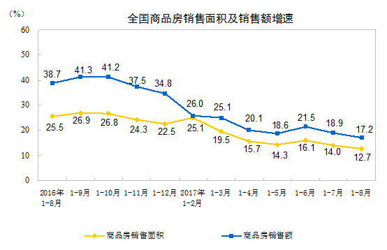 1-8月份,商品房销售面积98539万平方米,同比增长12.7%,增速比1-7月份回落1.3个百分点。其中,住宅销售面积增长10.3%,办公楼销售面积增长32.3%,商业营业用房销售面积增长26.9%。商品房销售额78096亿元,增长17.2%,增速回落1.7个百分点。其中,住宅销售额增长14.2%,办公楼销售额增长26.6%,商业营业用房销售额增长35.4%。