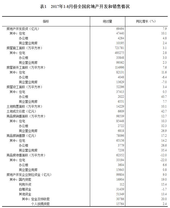 1-8月份,房地产开发企业到位资金99804亿元,同比增长9.0%,增速比1-7月份回落0.7个百分点。其中,国内贷款16904亿元,增长19.0%;利用外资112亿元,增长15.4%;自筹资金31439亿元,下降1.7%;其他资金51349亿元,增长13.4%。在其他资金中,定金及预收款30786亿元,增长20.0%;个人按揭贷款15764亿元,增长2.4%。