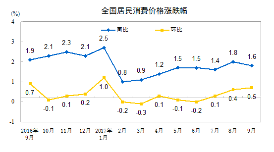 2017年9月份居民消费价格同比上涨1.6%