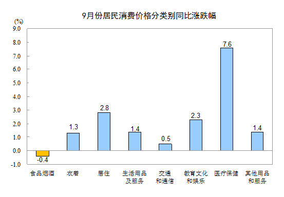9月份,其他七大类价格同比均有不同程度的上涨。其中,医疗保健、居住、教育文化和娱乐价格分别上涨7.6%、2.8%和2.3%,生活用品及服务、其他用品和服务价格均上涨1.4%,衣着、交通和通信价格分别上涨1.3%和0.5%。