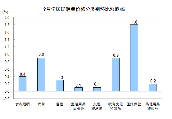 9月份,其他七大类价格环比均有不同程度的上涨。其中,医疗保健、居住、交通和通信价格分别上涨1.8%、0.3%和0.1%,其他用品和服务、生活用品及服务价格分别上涨0.2%和0.1%;衣着、教育文化和娱乐价格均上涨0.9%。