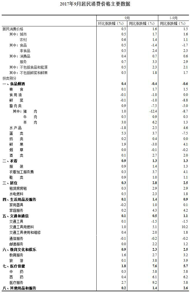 2017年9月份,全国居民消费价格同比上涨1.6%。其中,城市上涨1.7%,农村上涨1.4%;食品价格下降1.4%,非食品价格上涨2.4%;消费品价格上涨0.7%,服务价格上涨3.3%。1-9月平均,全国居民消费价格总水平比去年同期上涨1.5%。
