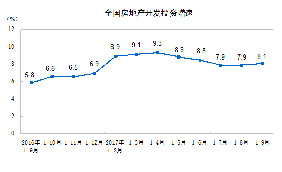 2017年1-9月份,全国房地产开发投资80644亿元,同比名义增长8.1%,增速比1-8月份提高0.2个百分点。其中,住宅投资55109亿元,增长10.4%,增速提高0.3个百分点。住宅投资占房地产开发投资的比重为68.3%。