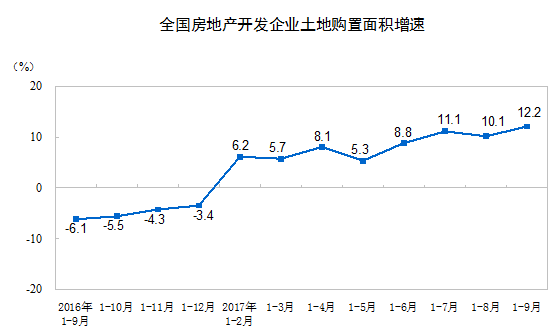 1-9月份,房地产开发企业土地购置面积16733万平方米,同比增长12.2%,增速比1-8月份提高2.1个百分点;土地成交价款8149亿元,增长46.3%,增速提高3.6个百分点。