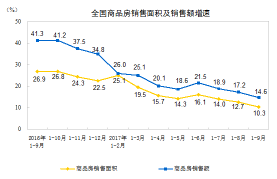 1-9月份,商品房销售面积116006万平方米,同比增长10.3%,增速比1-8月份回落2.4个百分点。其中,住宅销售面积增长7.6%,办公楼销售面积增长32.7%,商业营业用房销售面积增长23.7%。商品房销售额91904亿元,增长14.6%,增速回落2.6个百分点。其中,住宅销售额增长11.4%,办公楼销售额增长25.2%,商业营业用房销售额增长31.8%。