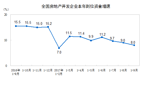 1-9月份,房地产开发企业到位资金113095亿元,同比增长8.0%,增速比1-8月份回落1个百分点。其中,国内贷款19003亿元,增长19.5%;利用外资113亿元,增长0.9%;自筹资金36451亿元,下降0.3%;其他资金57528亿元,增长10.4%。在其他资金中,定金及预收款34610亿元,增长16.9%;个人按揭贷款17739亿元,增长1.3%。