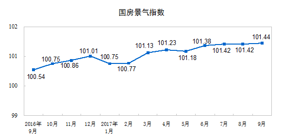 9月份,房地产开发景气指数(简称“国房景气指数”)为101.44,与8月份提高了0.02点。